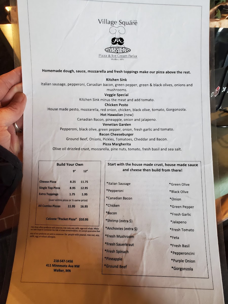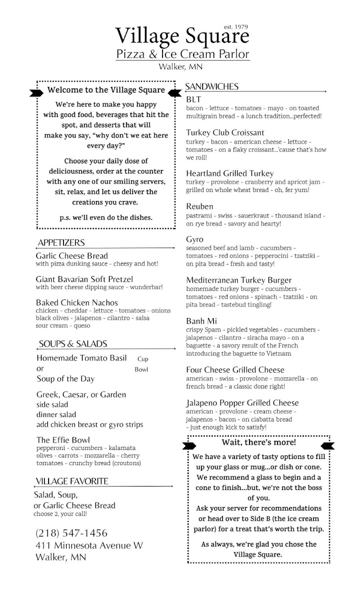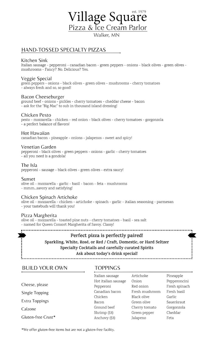 The menu at Village Square Pizza & Ice Cream Parlor is a perfect blend of classic comfort food and delightful sweet treats. Whether you're in the mood for a mouth-watering slice of pizza, a crisp salad, or a creamy scoop of ice cream, there's something for everyone to enjoy. Located in the heart of Walker, MN, this charming eatery offers a variety of flavors to suit every taste. The pizza menu features everything from hearty meat lovers' choices to fresh veggie options, all topped with premium ingredients. For dessert, indulge in their selection of homemade ice creams that offer a perfect ending to your meal. With its welcoming atmosphere and delicious menu, it's the perfect spot to unwind and treat yourself to some local favorites.
